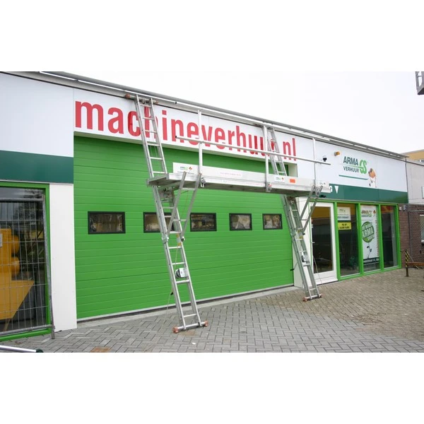 Speciaal geschikt voor onderhoudswerk aan gevels. Werkbrug wordt geplaatst op 2 mastframes met lier. Werkbrug is voorzien van een leuning aan 1 zijde waardoor er veilig op hoogte gewerkt kan worden. Alle steigers voldoen aan de 2718 NEN norm en worden jaarlijks gekeurd.