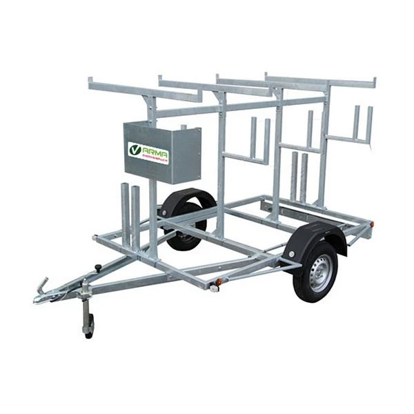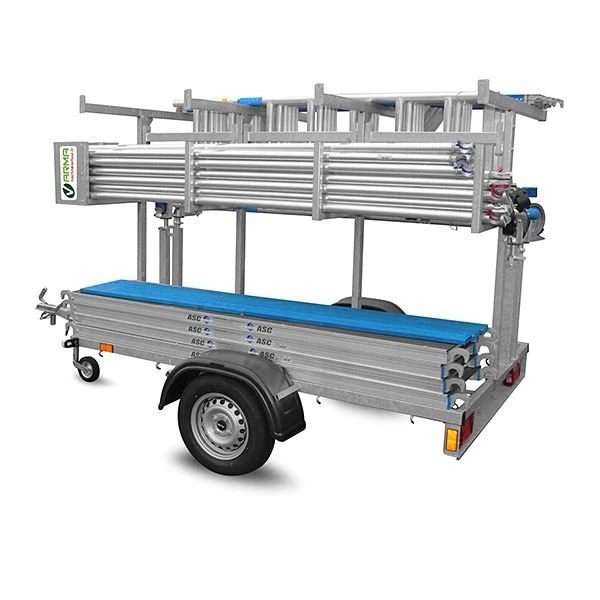 Een open aanhanger speciaal voor het vervoeren van rolsteigers tot een vloerhoogte van 12,5 m
