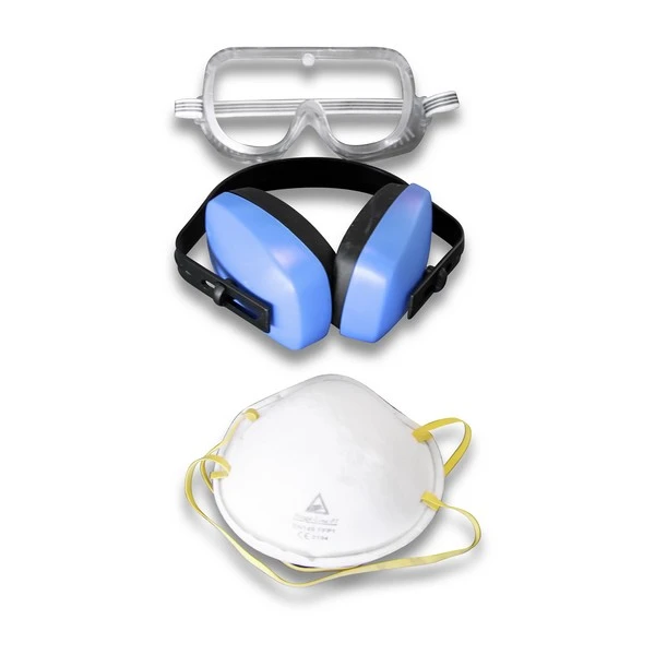 Veiliheidssetje : Gehoorbeschermer, veiligheidsbril en stofmasker (verkoop)